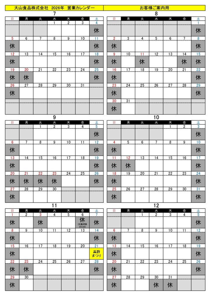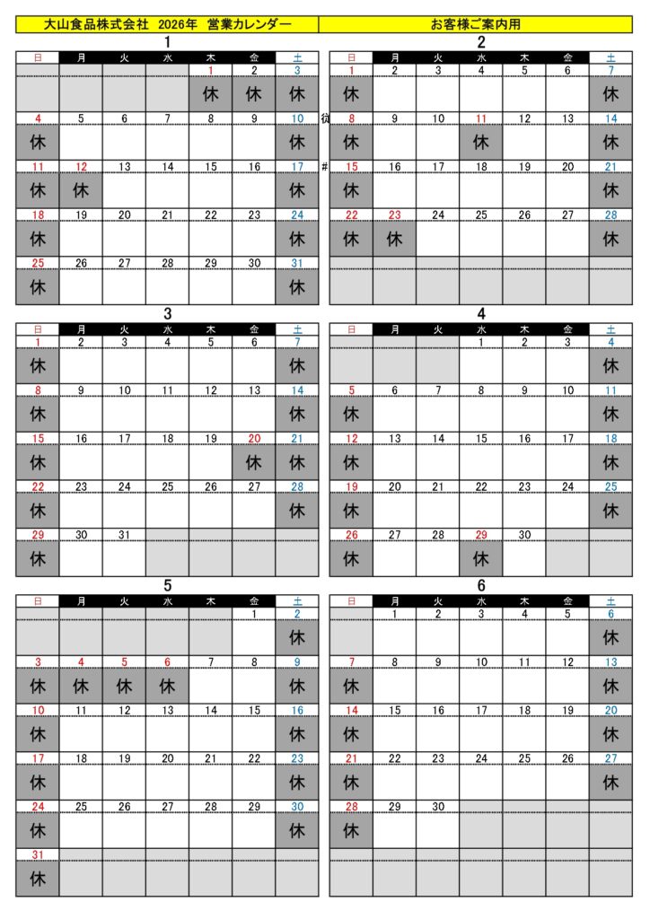 2026年営業カレンダー