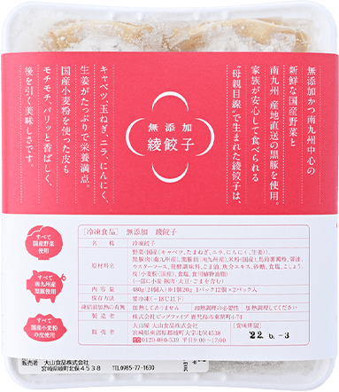野菜(国産(キャベッ、たまねぎ、ニラ、にんにく、生娑))、黒豚肉(南九州産)、黒豚脂(南九州産)、米粉(国産)、馬鈴薯澱粉、醤油、ウスターソース、発酵調味料、ごま油、魚介エキス、砂糖、食塩、こしょう、皮(小麦粉(国産)、食塩、食用植物油脂)(一部に小麦・豚肉・大豆・ごまを含む)
