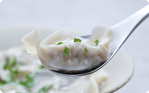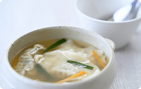 沸騰したスープや鍋に餃子を入れると、2~3分でゆであがります。鶏ガラスープやコンソメスープ等がよく合います。(煮込みすぎると、餃子が崩れやすくなりますのでご注意ください。)