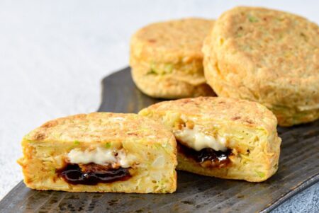 キャベツ(国産)、卵(国産)、お好み焼きソース、こんにゃく、マヨネーズ、なたね油、ココナッツミルク、とろろ、フライドオニオン、食塩、鰹節粉、椎茸粉、醤油、きび砂糖、ごま油/水酸化カルシウム、(一部に小麦・大豆・卵・やまいも・バナナ・リンゴ・ごまを含む)