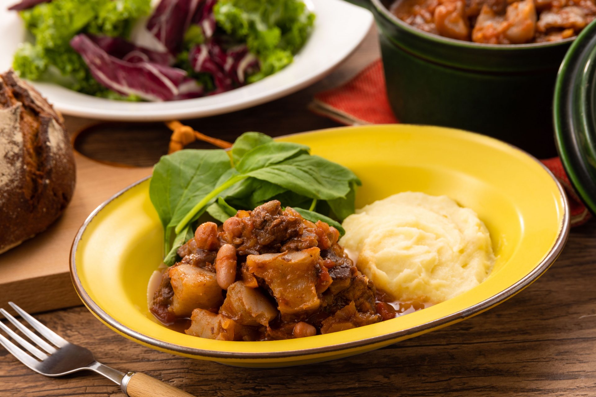 マッシュポテトやパスタを添えると、ボリュームのあるメインディッシュになります。豆を加えて煮込むことで適度にとろみがつきますが、無い場合は、野菜を炒める時に大さじ1の小麦粉を加えると水っぽくなりません。
