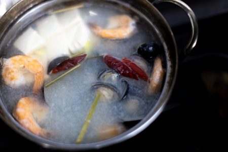 余ったスープに炊いたご飯(余ったご飯でも)を入れ、柚子ホットソース マーシーを加えてひと煮たちさせると、海鮮出汁の酢っぱ辛いおじやに。