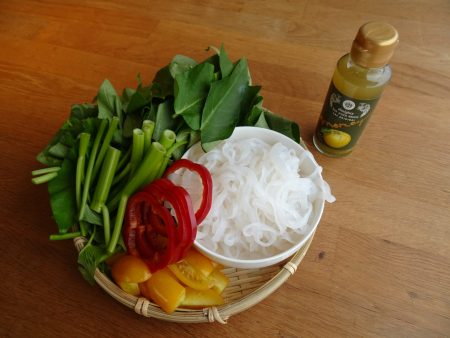 - 空芯菜は長めにカット。パプリカは輪切り、トマトは半月切り、こんにゃくもお好みの長さにカット。