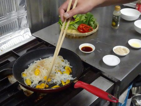 - フライパンにサラダ油を引き、きしめん風しらたき糸こんにゃくを強火で炒める。