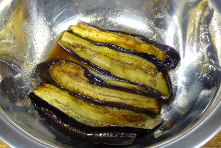マーシーと醤油を混ぜ合わせ、焼いたなすと絡めて完成。