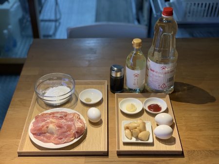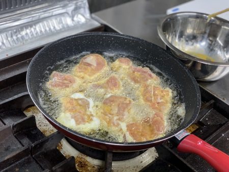 - フライパンに多めの油を入れて170度に熱し鶏もも肉を入れ、途中返しながら全体がこんがりと色づくまで揚げ焼きにする。