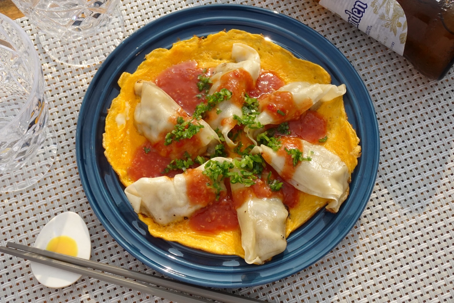 綾餃子の味がしっかりとしているので、お塩を振りかけるだけでも美味しい、余った焼き餃子の定番アレンジレシピのオム餃子。溶いた卵にチーズを入れても美味しく。たまご料理によく合う黒酢の手作りソースを合わせました。